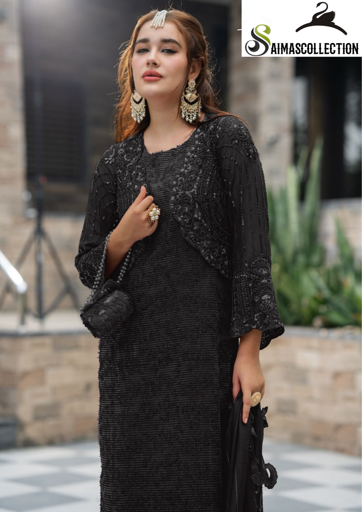 Intricate detailing & illuminated delicate work on Short Jacket and Morden framing long Shirt paired with loose pants and Beautiful dupatta making it unmistakable couture