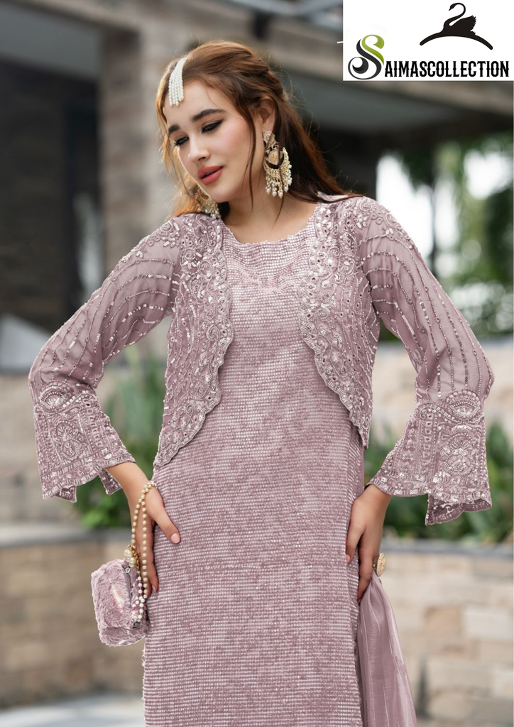 Intricate detailing & illuminated delicate work on Short Jacket and Morden framing long Shirt paired with loose pants and Beautiful dupatta making it unmistakable couture