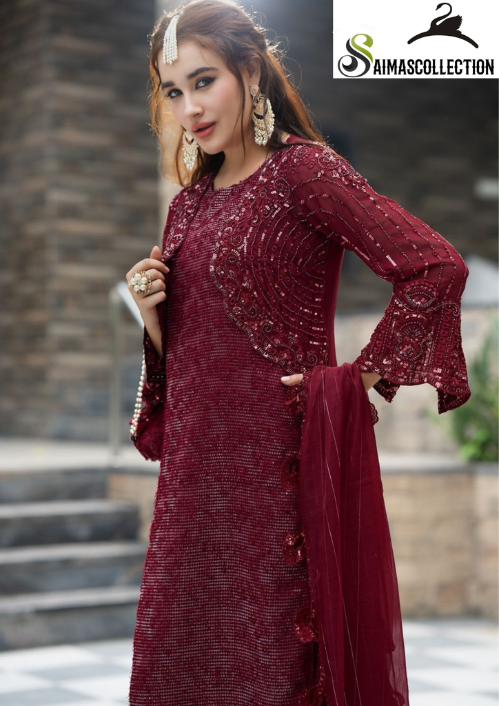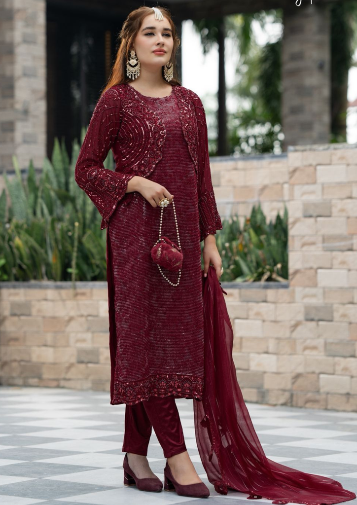 Intricate detailing & illuminated delicate work on Short Jacket and Morden framing long Shirt paired with loose pants and Beautiful dupatta making it unmistakable couture