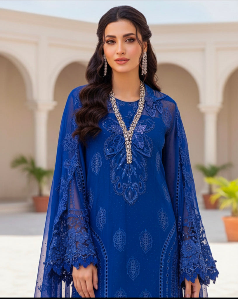 Immerse yourself in the timeless allure of Neelam, a majestic sapphire-blue ensemble that exudes regal sophistication. Crafted with delicate threadwork and intricate lace detailing along the borders and sleeves, this outfit captures the perfect balance of grace and grandeur.