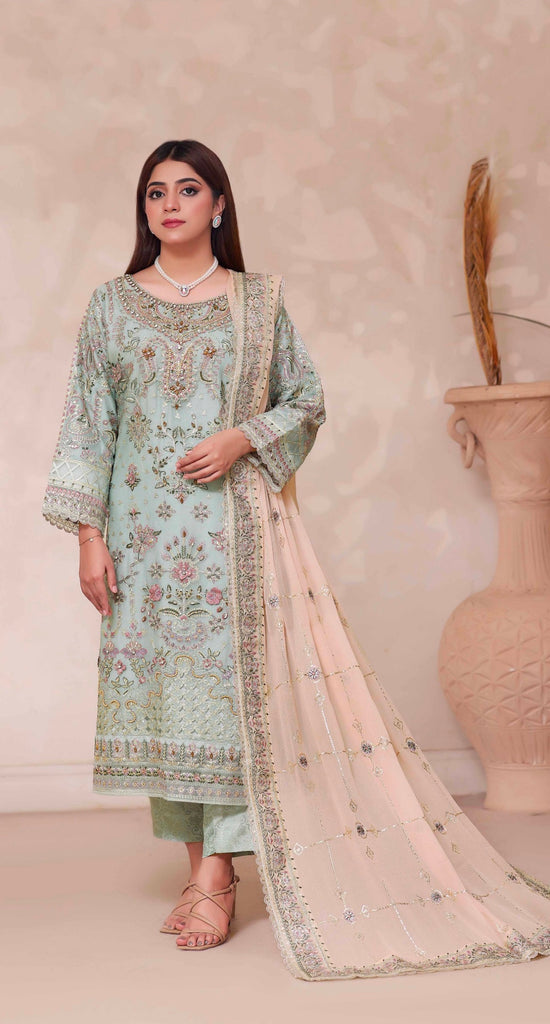 A beautifully crafted mint green embroidered suit set that blends timeless craftsmanship with delicate pastel charm. The kurta features intricate floral and paisley embroidery in soft blush, gold, and sage tones, enhanced with fine threadwork and subtle embellishments that add depth without overpowering the look.