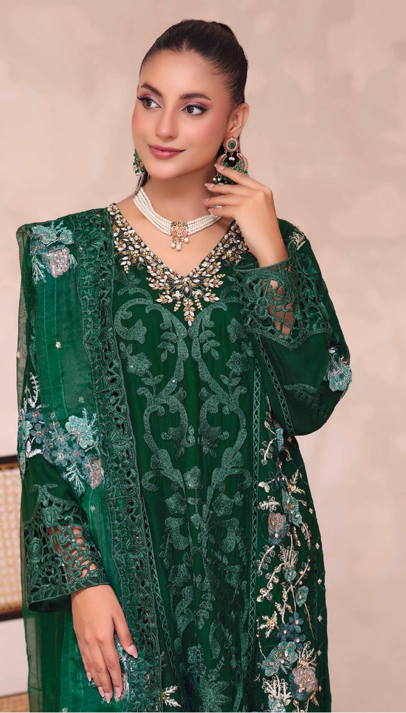 Completing the look is a sheer chiffon dupatta, finished with embroidered floral motifs and an ornate border, adding fluidity and charm to the outfit. The deep green tone gives a royal appeal, making it a perfect choice for Eid, festive gatherings, weddings, and evening events.