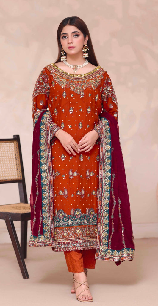 A richly detailed Pakistani suit set in a rust orange base, adorned with fine antique gold, teal, and wine embroidery. The shirt features an intricately embellished neckline with traditional motifs, complemented by delicate all-over buti work that adds depth without heaviness.