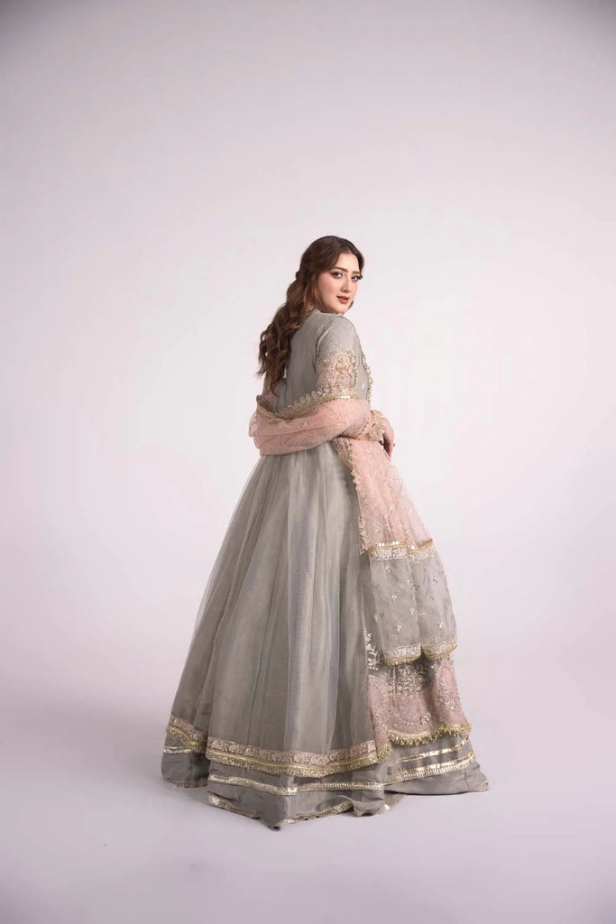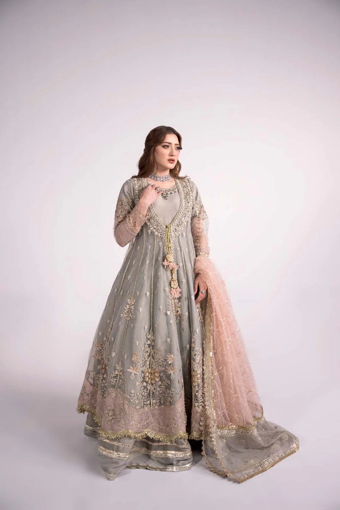 A dreamy pastel masterpiece — this elegant grey and blush pink gown features exquisite floral embroidery, delicate sequin work, and a flowing silhouette that exudes timeless grace. Paired with a sheer embellished dupatta, it’s perfect for weddings, receptions, or festive soirées where sophistication meets tradition.