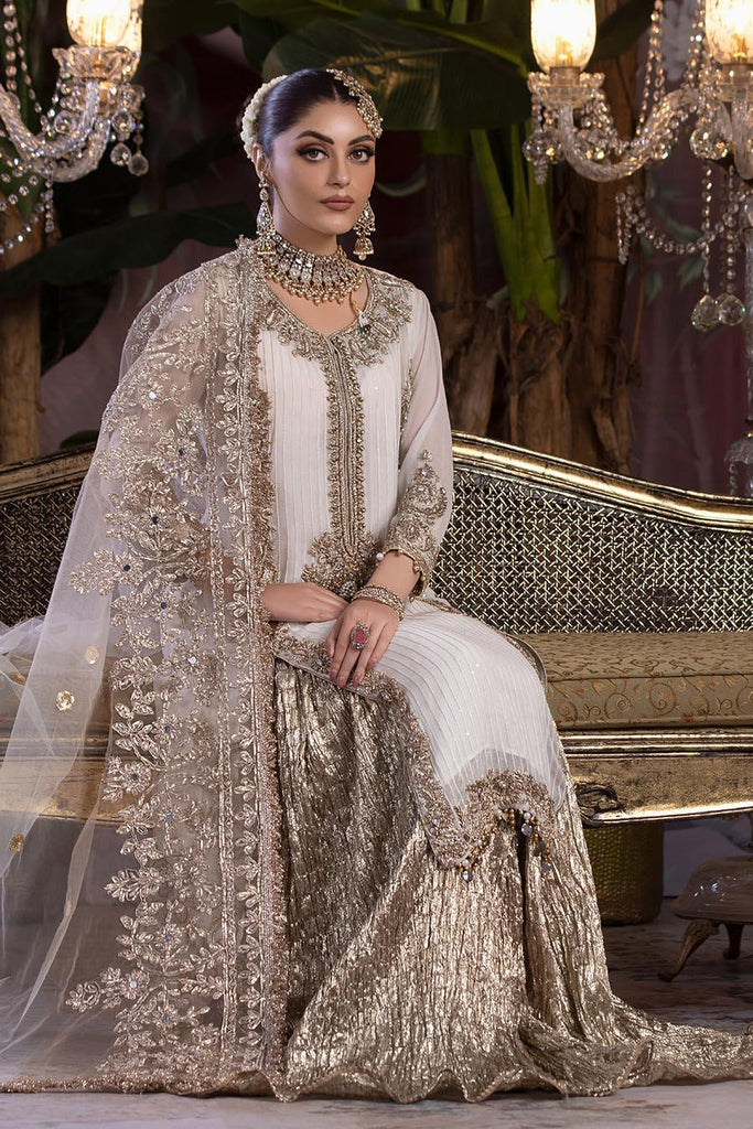 A symphony of grace unfolds in this ensemble. The Pure Crinkle Chiffon shirt, adorned with delicate Kora, Dabka, and Stones embroidery, exudes timeless allure. Its Net Dupatta, graced by Tilla work, trails like a silken breeze. And behold the flowing Crushed Silk Sharara.